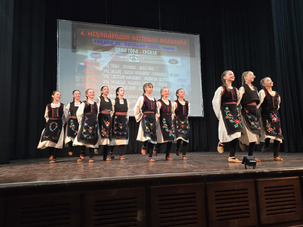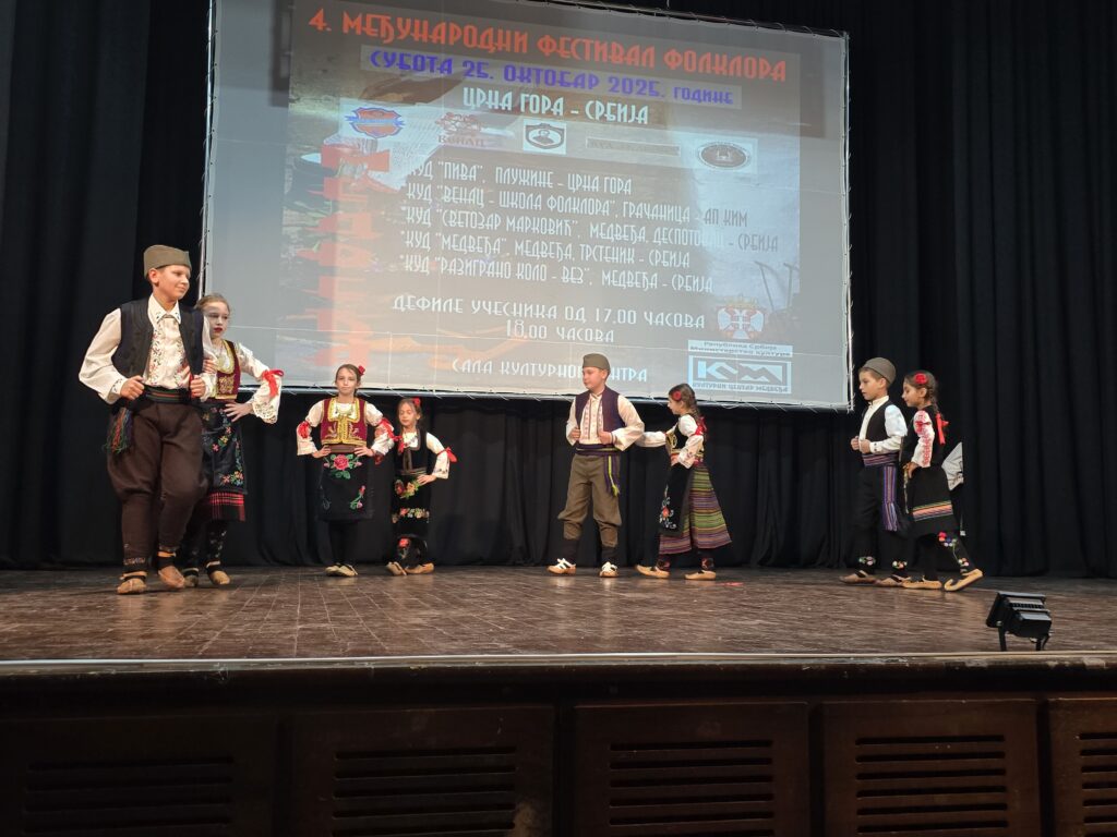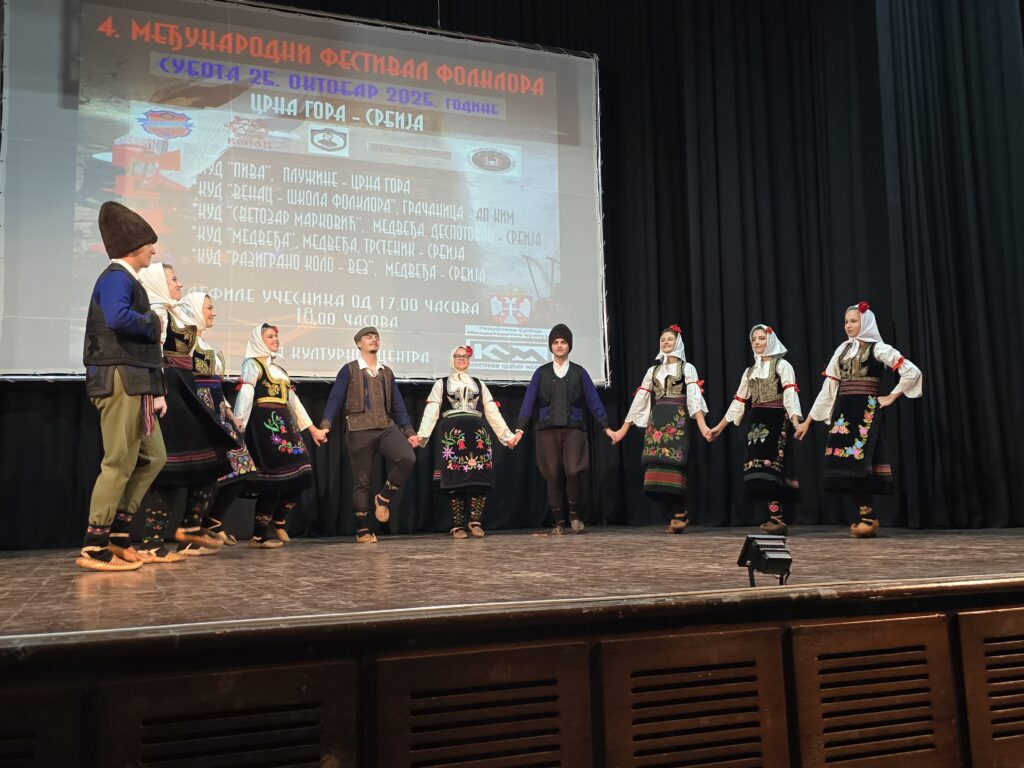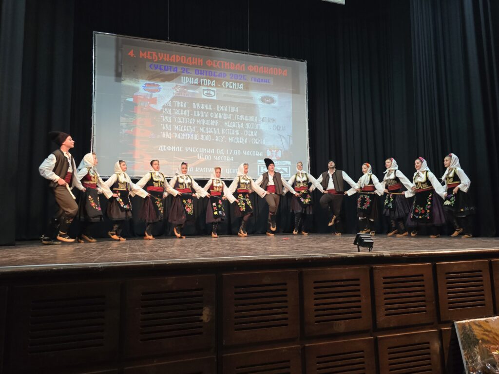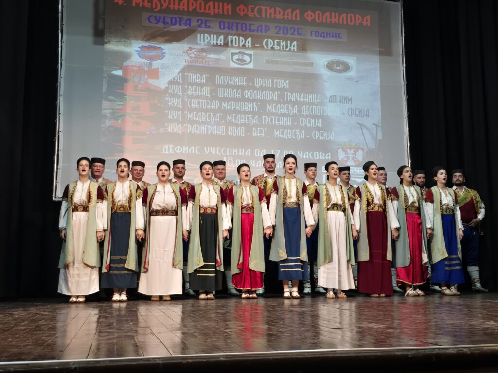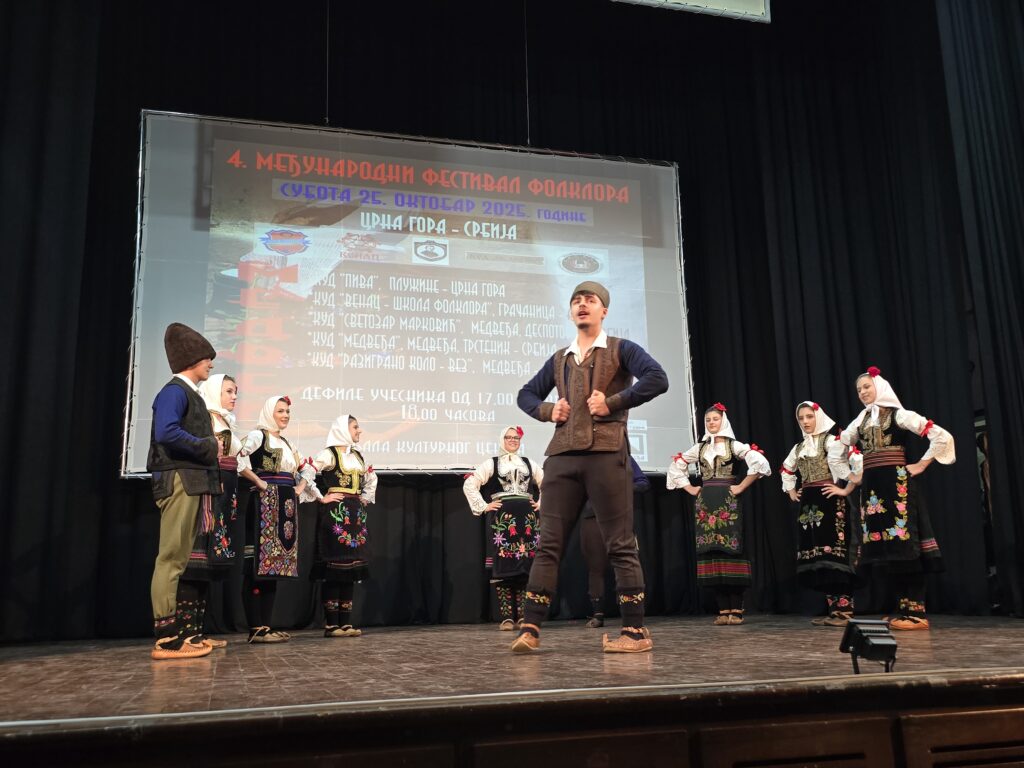 У суботу, 25. октобра 2025. године, у организацији Културног центра општине Медвеђа и уз финансијску подршку Министарства културе Републике Србије, одржан је 4. Међународни фестивал фолклора у Медвеђи. Ова манифестација, која из године у годину расте и по значају и по квалитету, окупила је културно-уметничка друштва из Србије, Косова и Метохије и Црне Горе, претварајући Медвеђу у центар народне игре, песме и пријатељства.